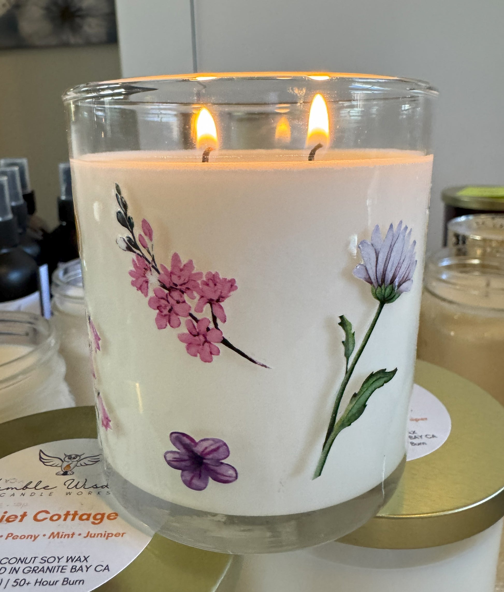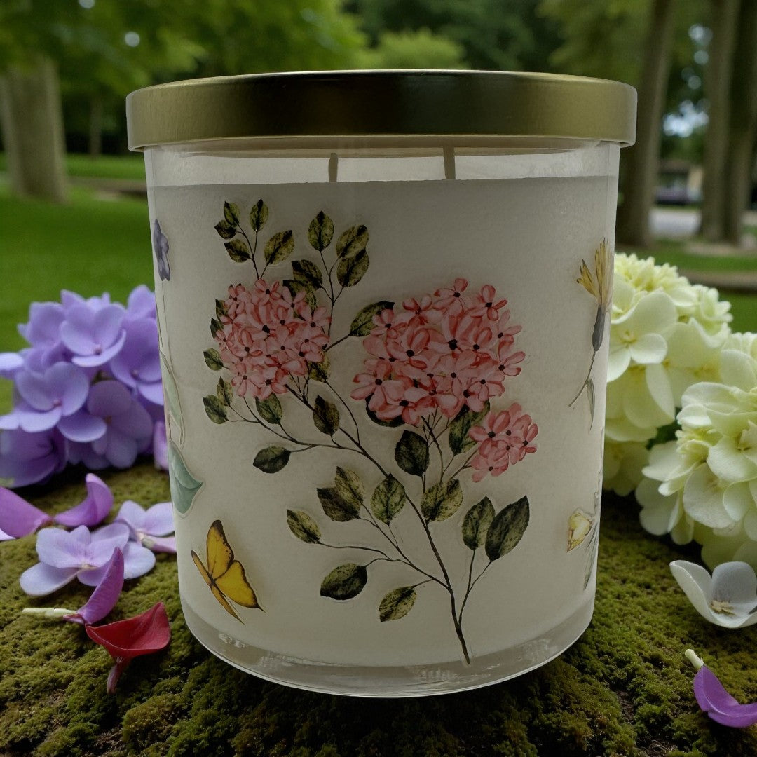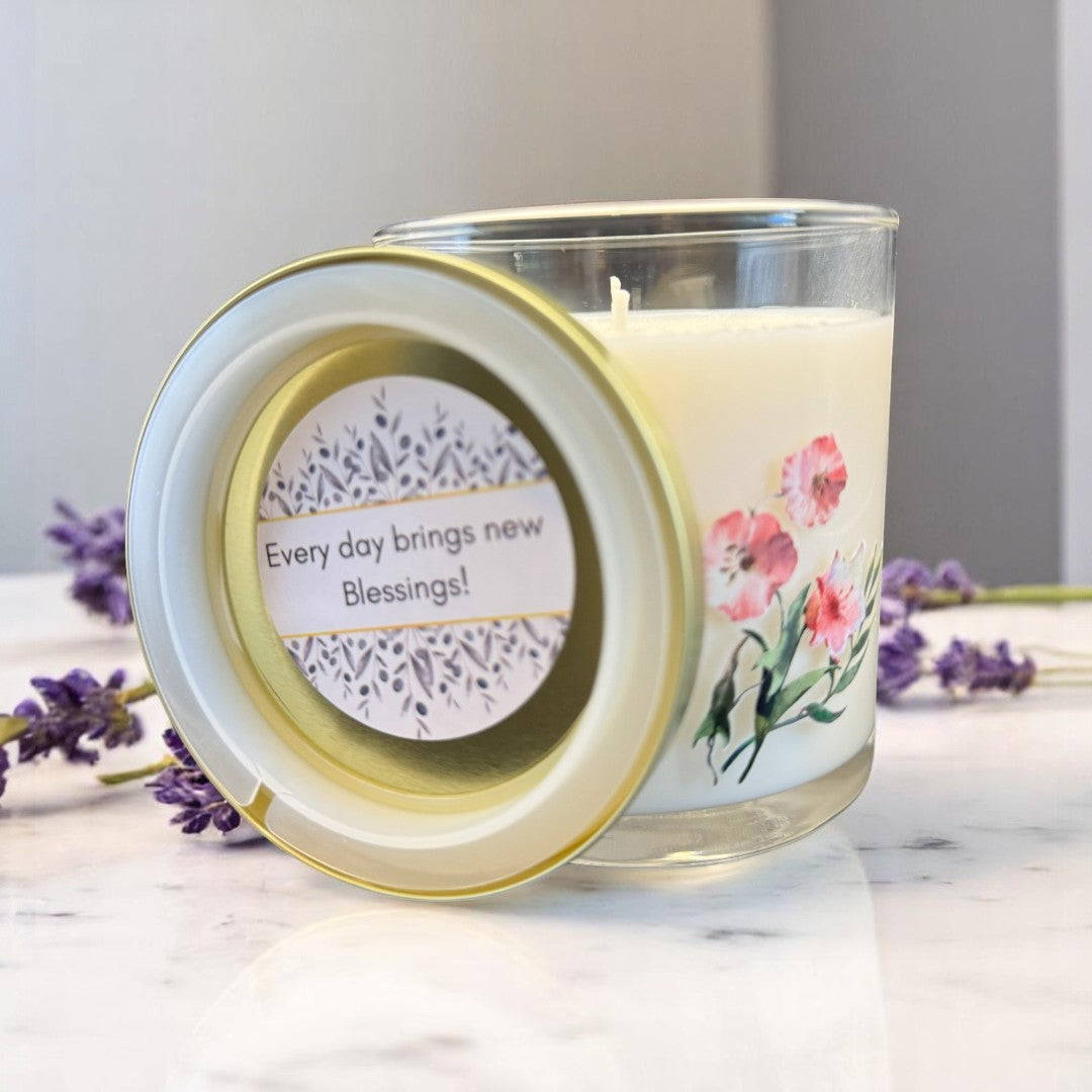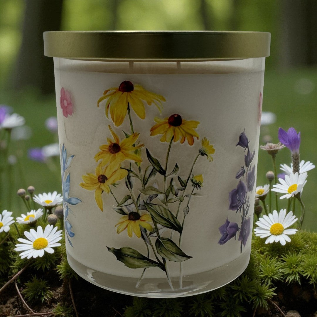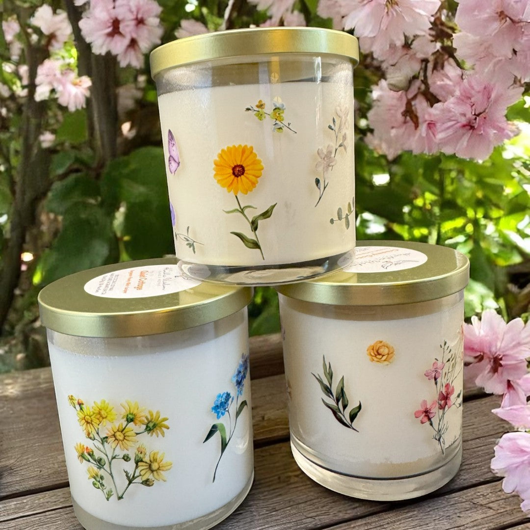 Each 8.5 oz candle is poured into a clear glass jar decorated with colorful wildflowers and finished with a shimmering gold lid — the perfect touch of elegance and seasonal joy. These beautiful, coconut soy candles are double wicked and thoughtfully crafted to bring light, comfort, and a sense of renewal into your space.